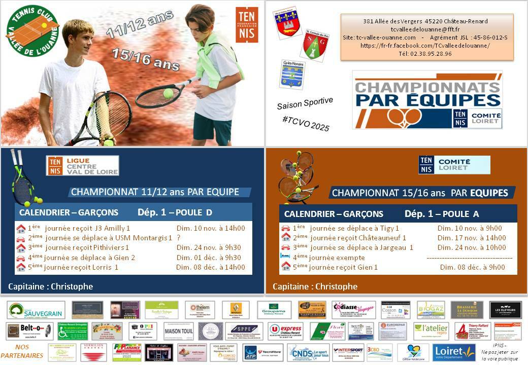 Calendrier des championnats jeunes 11/12 et 15/16 ans à partir du 10 novembre 2024