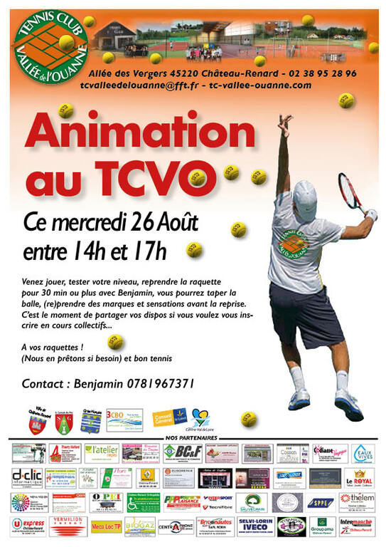 Animation au TCVO, venez jouer, tester votre niveau, reprendre la raquette pour 30 min ou plus ce mercredi 26 août entre 14h et 17h. Avec Benjamin,